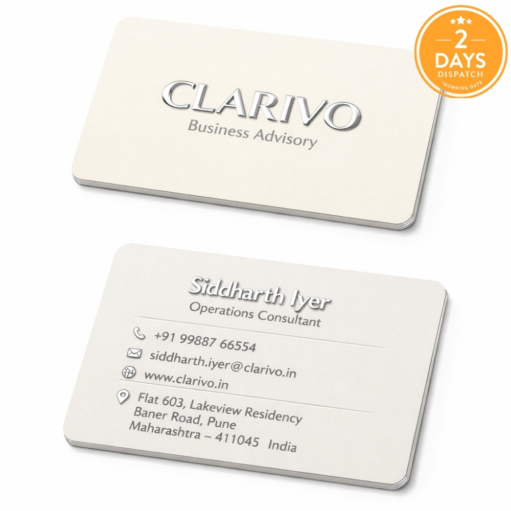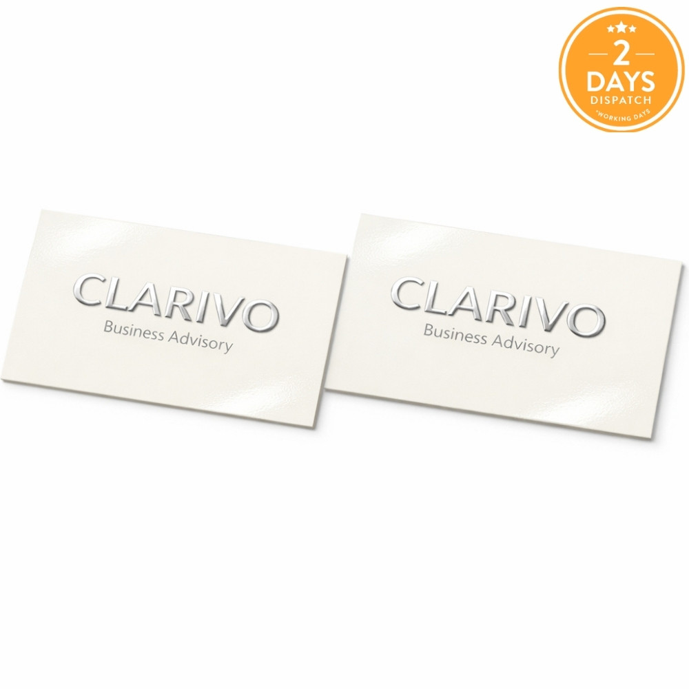 Enhance your business cards with Raised foil for a standout effect. Prepare your artwork by creating a Raised layer identical to your CMYK design. Use “Spot Colour” for precise foil application, focusing on elements with font sizes greater than 10 points. Save and submit your CMYK and Raised layers as separate PDFs for a premium finish.